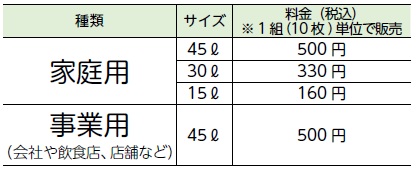 ●有料指定ごみ袋の種類と料金